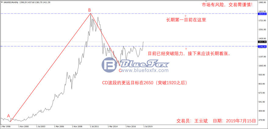 2019年7月中旬当黄金价格突破1350美元/盎司的阻力区域时,价格行为交易者在他的交易分析报告中说到,后期应该长期看涨黄金,第一目标价格为前期1920美元/盎司的高点,第二目标价格为2650美元/盎司(如下图)。