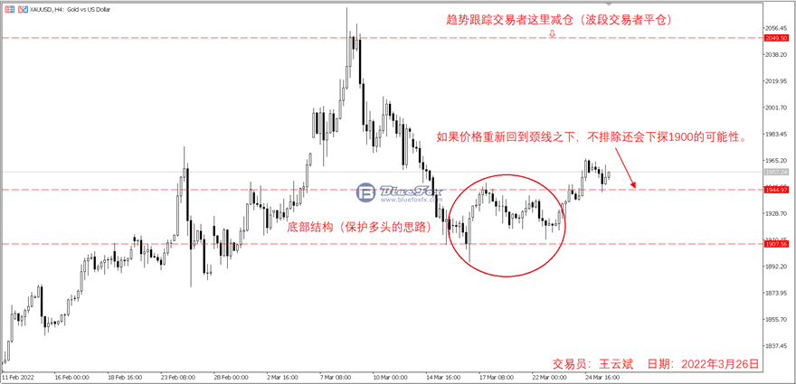 在价格行为交易者的分析报告出示之后的短短一周的时间,黄金价格出现飙升态势,并于2022年3月8日创下了2069的阶段性高点。那么,接下来应该如何交易呢?从目前四小时的图表来看,价格在1900区域构筑了一个底部结构,多头应该择机建立相应的仓位(如下图)。