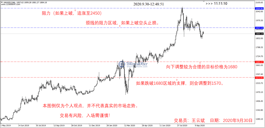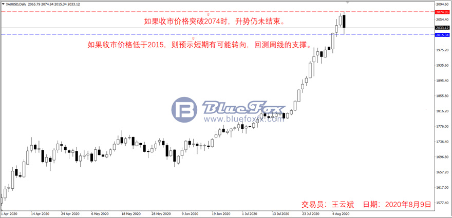 2019年底至2020年初,在全球疫情引起的恐慌情绪之下,黄金价格于2020年8月7日创下了2075美元/盎司的阶段性高点。与此同时,价格行为交易者对多头交易者提出警示,如果黄金价格的收市价格低于2015美元/盎司时,意味着黄金价格将会进一步走低,测试1680区域的支撑(如下面两张图)。