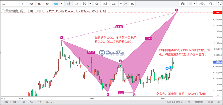 2021年3月8日黄金价格最低下跌至1676美元/盎司,随后一年的时间里,黄金价格就在1680~1916美元/盎司间宽幅震荡,构筑了一个空中双底形态。于是,价格行为交易者在2022年3月2日的交易分析报告中告诉交易者,后续黄金价格将开启新一轮的上涨走势,第一目标价格为2100美元/盎司,第二目标价格为2360美元/盎司(如下图)。